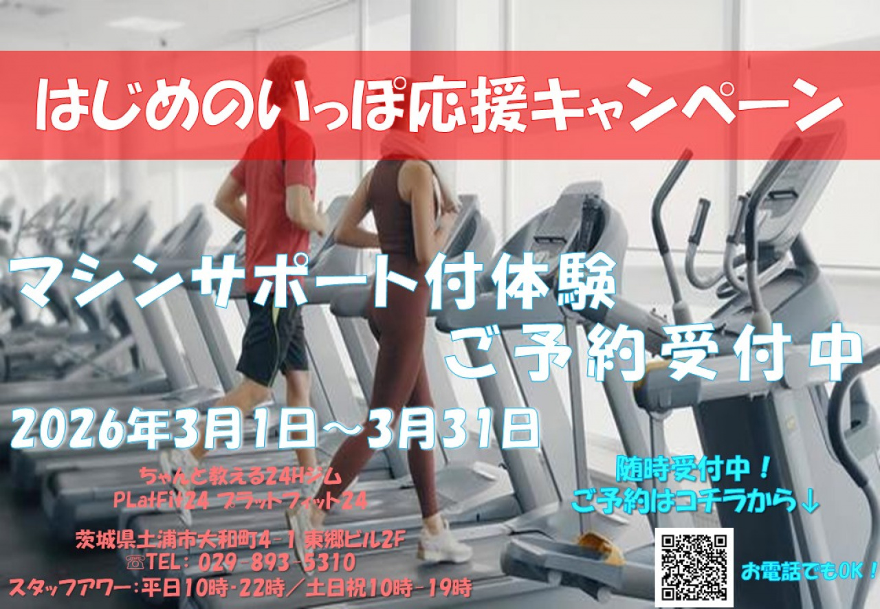 3月のPLatFit24では【はじめのいっぽ応援キャンペーン】と題し、ジム利用初心者さんに嬉しいキャンペーンを実施しています。